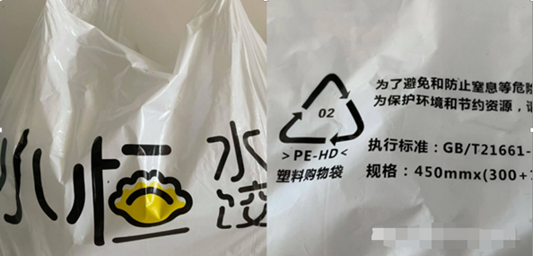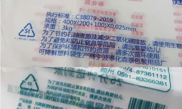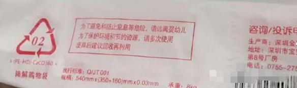 2.觀察外觀:全降解塑料袋的原材料是PLA、PBAT、淀粉或礦粉材料,在外袋上會有專門的標志,比如常見的“PBAT+PLA+MD”,而對于偽降解塑料袋,原料是PE等材料,常見的包括”PE-HD“等。
