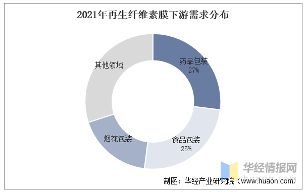 再生纖維素膜下游主要應用于食品包裝、藥品包裝、煙花包裝等領域。2021年,藥品包裝和食品包裝的需求占比最高,分別為27%、25%。