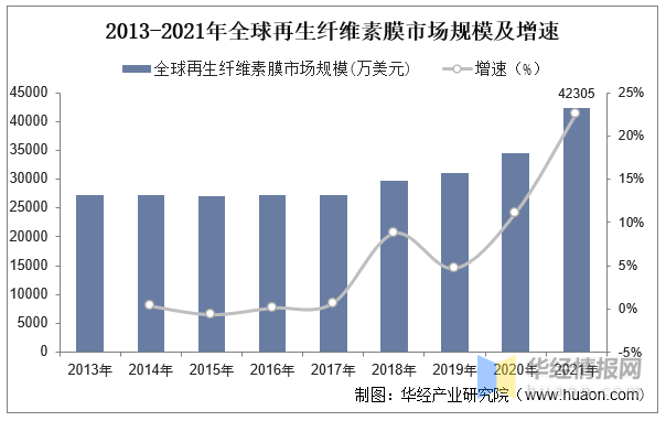 2010-2017年,全球再生纖維素膜市場規模較為穩定。基于國際國內禁塑或限塑法令、法規持續發布實施,2018年以來行業增速加快。據統計,2021年全球再生纖維素膜市場規模達到4.23億美元,同比增長22.5%。