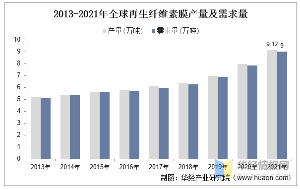 目前,亞洲和歐洲是全球再生纖維素膜的主要生產基地。數據顯示,2013年全球再生纖維素膜產量為5.2萬噸,需求量5.16萬噸;2021年全球再生纖維素膜產量增長至9.12萬噸,需求量達 9萬噸。