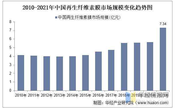 數據顯示,2010-2015年,國內再生纖維素膜市場規模變化表現得較為穩定,2016年之后其市場規模不斷增長,2021年保持高速增長至7.34億元,同比上升29.68%。