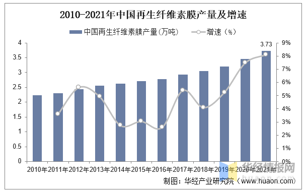 我國是全球再生纖維素膜生產大國,國內行業技術水平和治污能力不斷提升,國內外市場需求旺盛的現狀促進國內再生纖維素膜行業穩步增長,2021年中國再生纖維素膜產量達到3.73萬噸,同比增長8.12%。