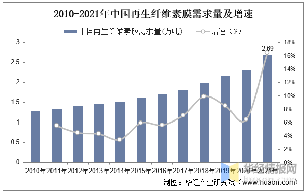 從需求端上看,再生纖維素膜綠色環保、美觀、耐高溫、具有一定的收縮性和透氣性的特點,近年來需求量逐步增長,由2010年的1.28萬噸提升至2021年的2.69萬噸,期間年均復合增長率為6.98%。