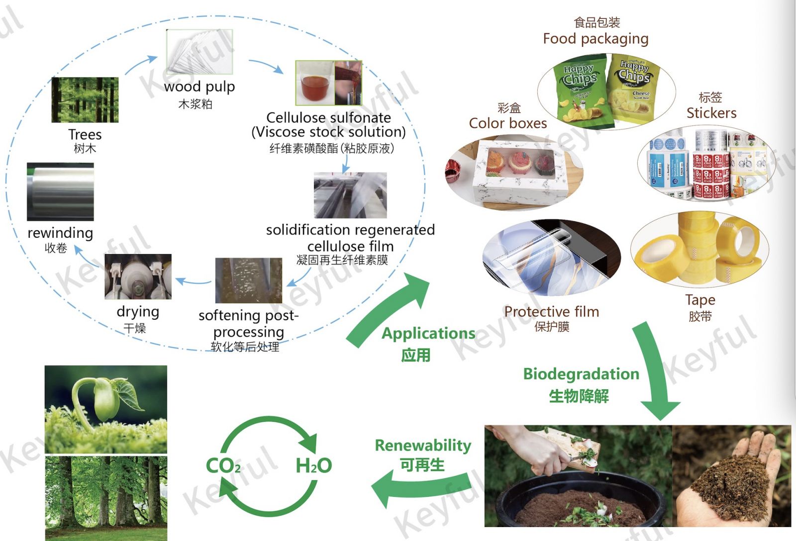纖維素膜在家庭堆肥或者工業(yè)堆肥的條件下,在十二個月內(nèi)最終會降解成為水和二氧化碳,對大自然完全無害,